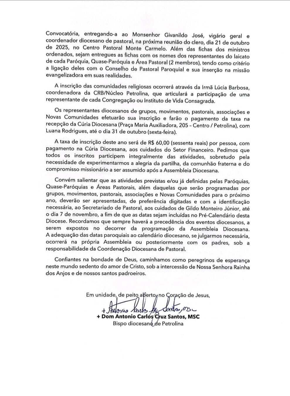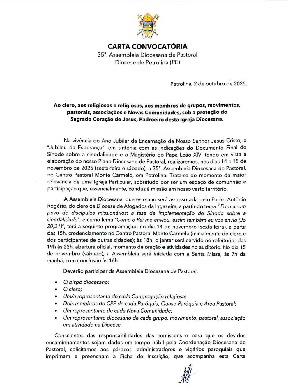 Divulgada, na manhã desta quinta-feira, 2 de outubro, a Carta Convocatória para a 35ª Assembleia Diocesana de Pastoral, a ser realizada em Petrolina nos dias 14 e 15 de novembro. Confira: