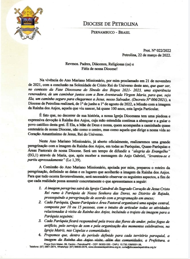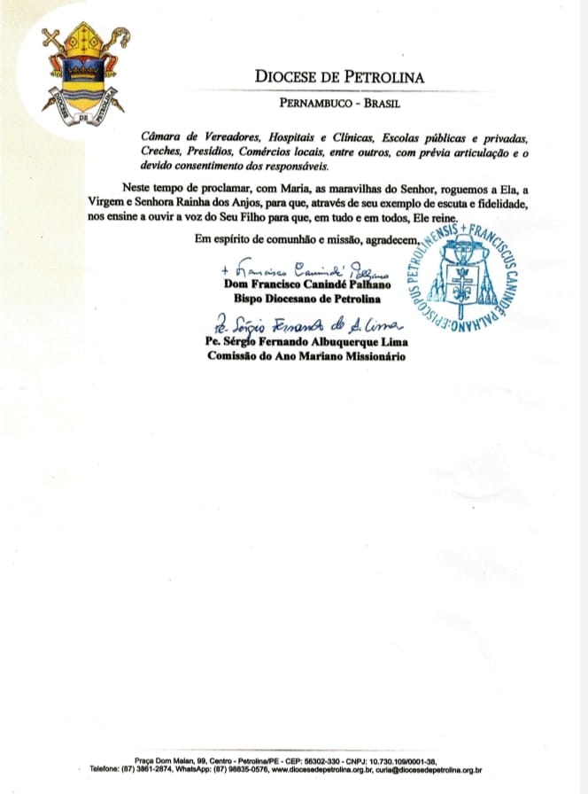 Carta de Dom Francisco sobre a peregrinação com a Rainha dos Anjos