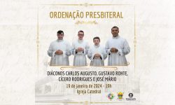 A Diocese de Petrolina, nas alegrias do seu Jubileu Centenário, anuncia a Ordenação Presbiteral dos Diáconos Carlos Augusto Faria Ribeiro, Cícero Rodrigues da Purificação, Gustavo Rohte de Oliveira e José Mário Mendes, no dia 19 de janeiro de 2024 (sexta-feira), às 19h, na Igreja Catedral do Sagrado Coração de Jesus Cristo Rei. Demos graças a Deus!