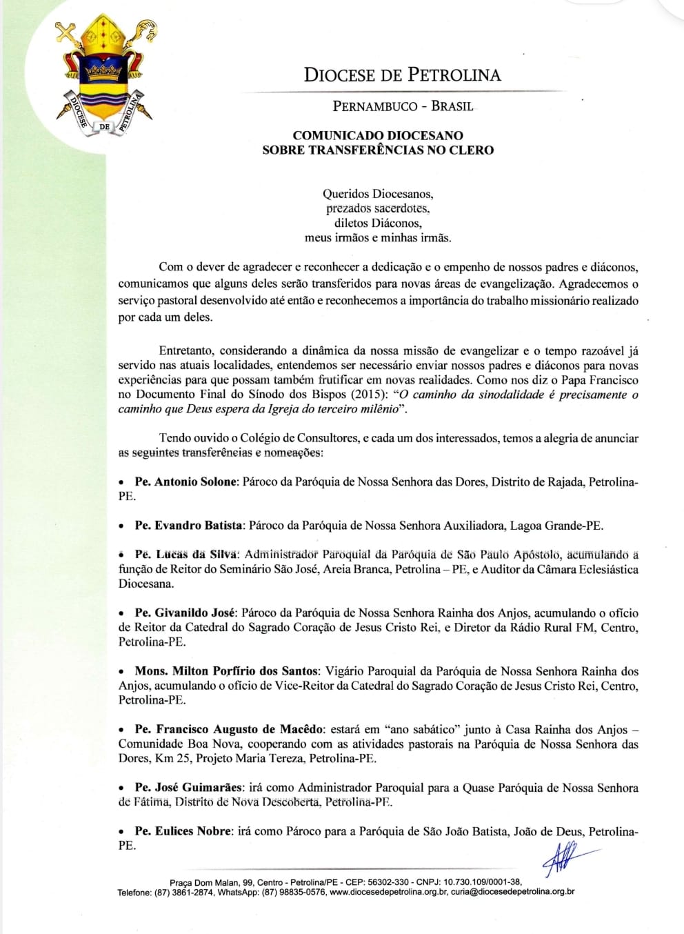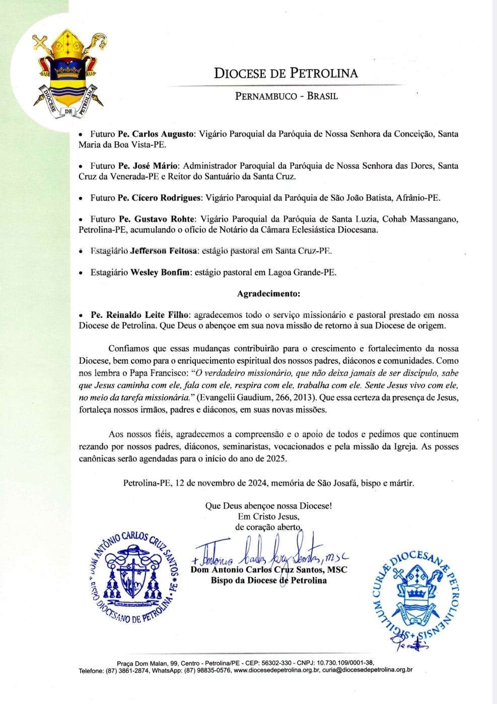 Nesta terça-feira, 12 de novembro de 2024, Dom Antonio Carlos Cruz Santos, MSC, Bispo de Petrolina, emitiu Comunicado anunciando nomeações e transferências .