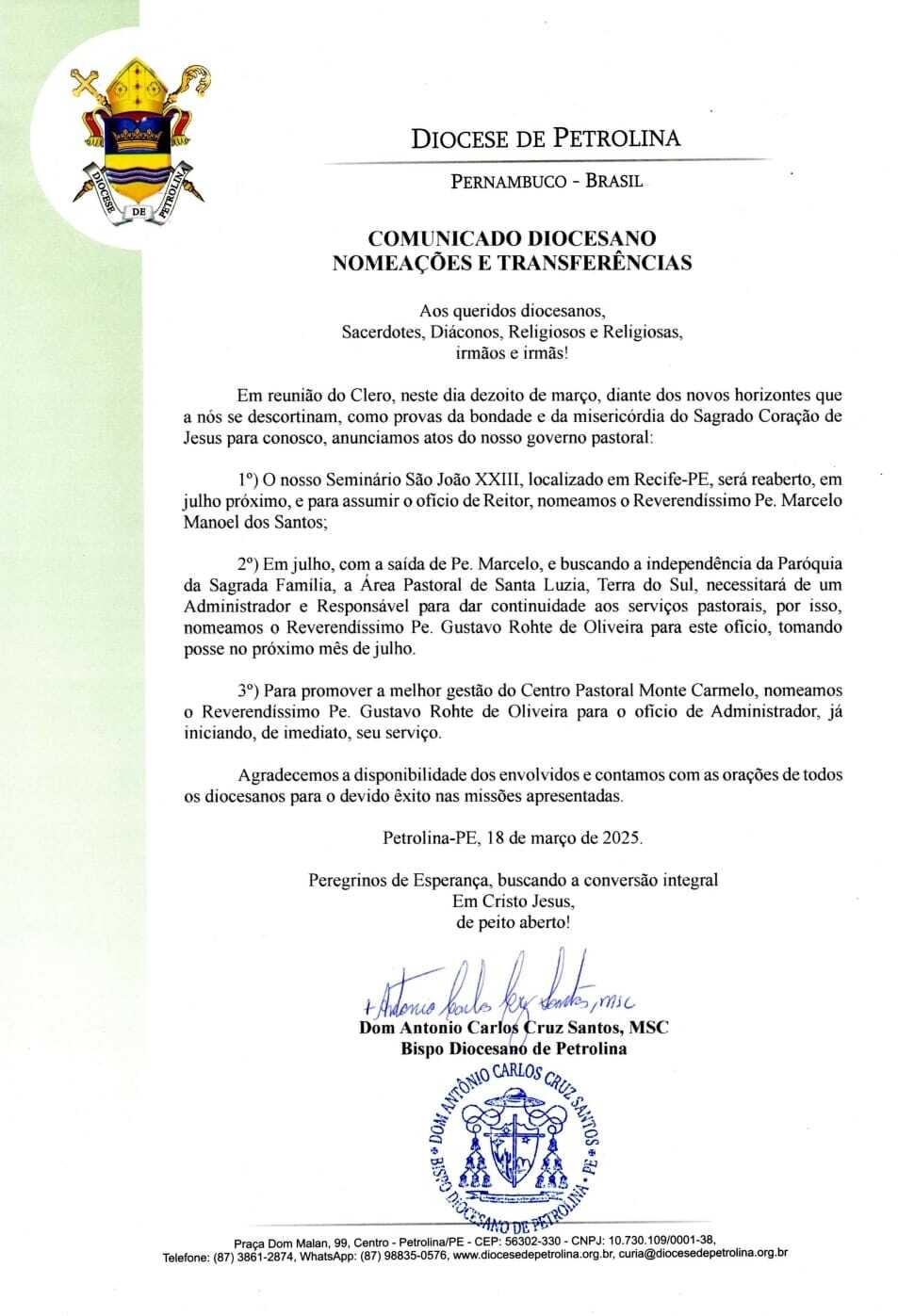 Após a reunião do clero, realizada nesta terça-feira, 18 de março, Dom Antonio Carlos Cruz Santos, Bispo de Petrolina, comunica a nomeação do Padre Gustavo Rohte de Oliveira como administrador da Área Pastoral de Santa Luzia, em Petrolina, com a transferência, no mês de julho, do Padre Marcelo Manoel dos Santos para Recife, onde assumirá o ofício de Reitor do Seminário São João XXIII, que será reaberto. O Padre Gustavo Rohte também acumulará o ofício de administrador do Centro Pastoral Monte Carmelo, de imediato. Confira: