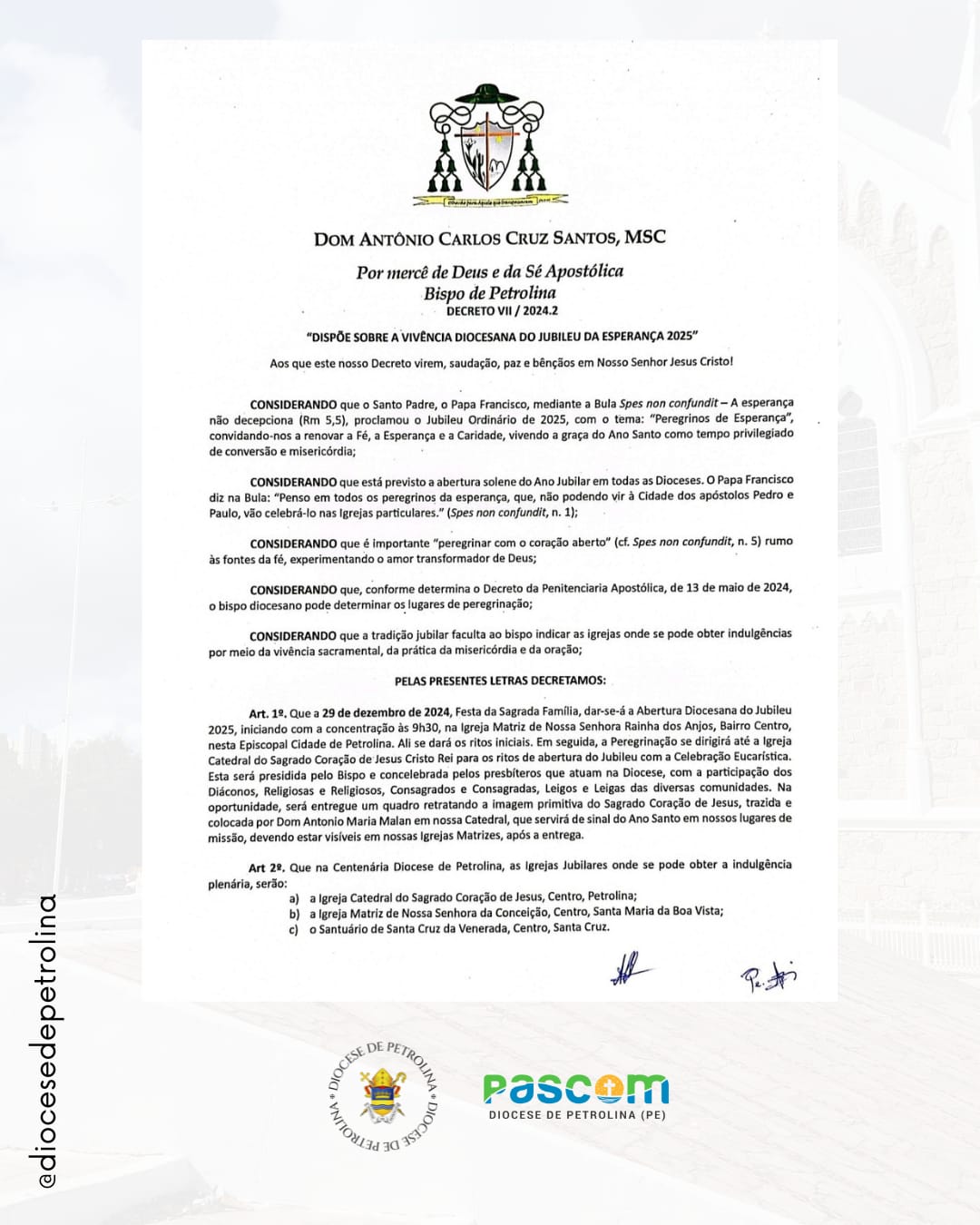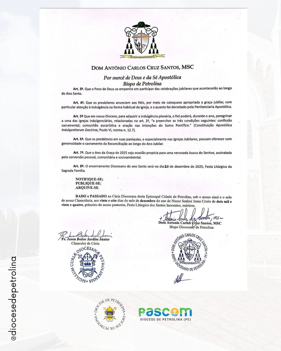 O Chanceler do Bispado, Padre Jason Bedor Jardim Júnior, durante a Santa Missa de abertura do Ano Jubilar, fez a leitura do Decreto acerca da vivência do Jubileu da Esperança na Diocese de Petrolina, incluindo as igrejas jubilares e as indulgências próprias deste tempo.