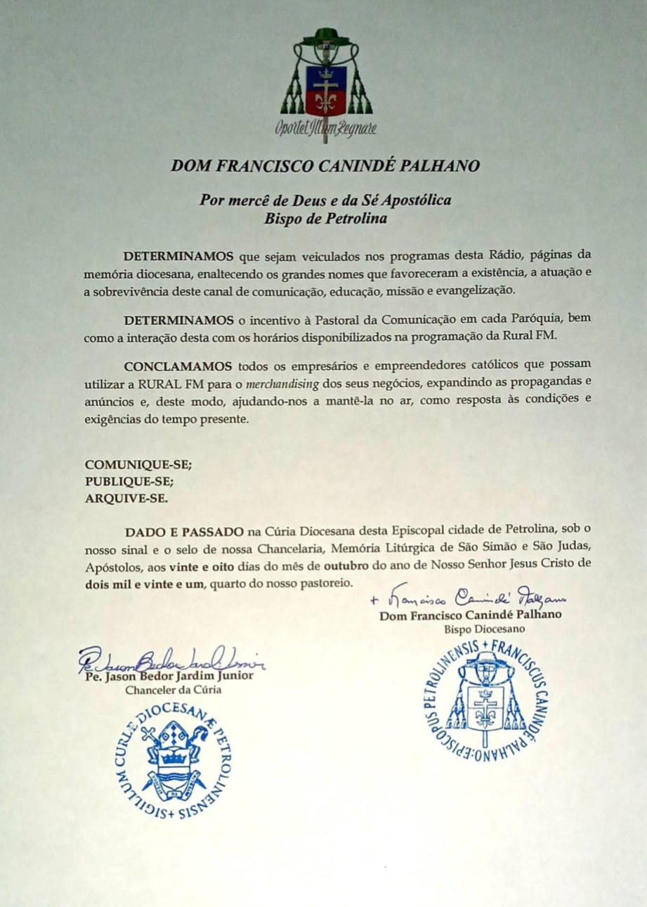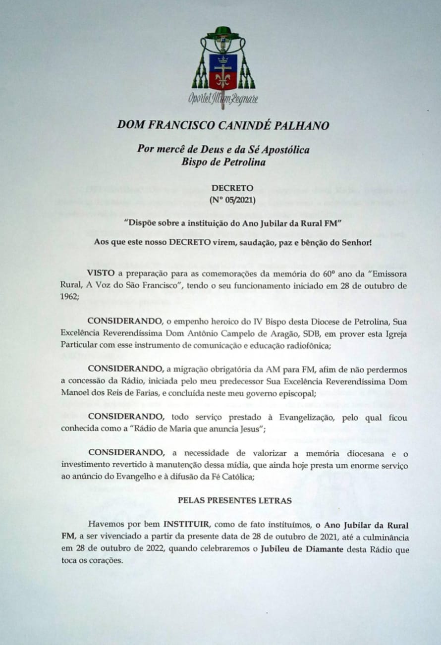 Decreto de Dom Francisco Canindé Palhano instituindo o “Ano Jubilar da Rural FM”.