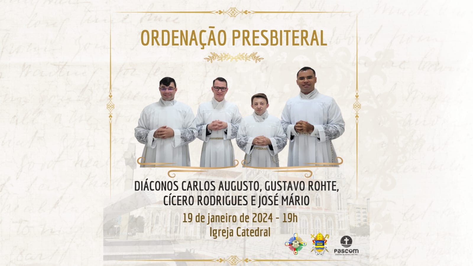 A Diocese de Petrolina, nas alegrias do seu Jubileu Centenário, anuncia a Ordenação Presbiteral dos Diáconos Carlos Augusto Faria Ribeiro, Cícero Rodrigues da Purificação, Gustavo Rohte de Oliveira e José Mário Mendes, no dia 19 de janeiro de 2024 (sexta-feira), às 19h, na Igreja Catedral do Sagrado Coração de Jesus Cristo Rei.