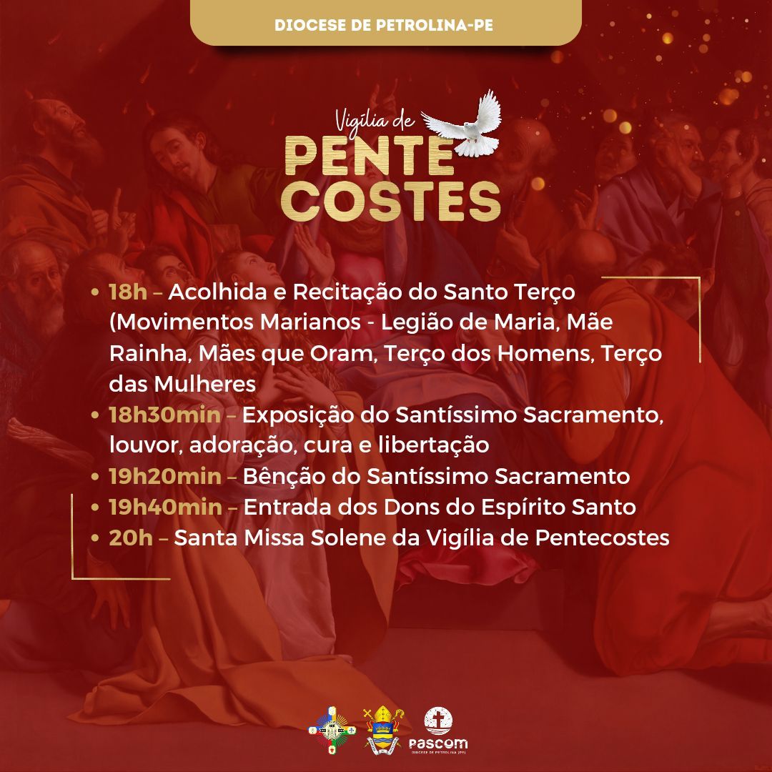 Na alegria do Senhor Ressuscitado, a Diocese de Petrolina convida todos os diocesanos para participarem da Vigília de Pentecostes, no próximo dia 27 de maio (sábado), a partir das 18h, na Igreja Catedral do Sagrado Coração de Jesus Cristo Rei (confira a programação completa abaixo).