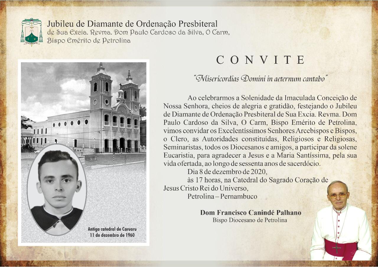 Dom Frei Paulo Cardoso da Silva, O.Carm, nosso sexto bispo diocesano, celebrará seus 60 anos de sacerdócio neste mês de dezembro. Em Petrolina, sua única Diocese, que teve o seu cuidado pastoral por mais de 26 anos (1/05/1985 a 27/07/2011), a Missa do Jubileu de Diamante de Ordenação Sacerdotal de Dom Paulo acontecerá no próximo dia 08 de dezembro, às 17h, na Igreja Catedral, na Solenidade da Imaculada Conceição. Dom Francisco Canindé, Bispo de Pterolina, emitiu convite dirigido aos Arcebispos, Bispos, ao clero e aos fiéis, a fim de que estejam em comunhão com esta data tão significativa para o nosso estimado Bispo Emérito e para o povo de Deus que reconhece o trabalho pastoral de Dom Paulo.