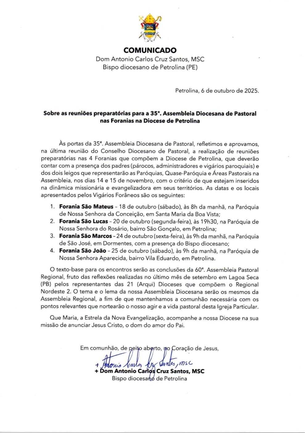 Aprovadas na última reunião do Conselho Diocesano de Pastoral, as reuniões preparatórias para a 35ª Assembleia Diocesana de Pastoral ocorrerão nas 4 Foranias que compõem esta Igreja Particular, motivando sacerdotes, religiosos e fiéis leigos a entrarem no dinamismo do maior evento eclesial da Diocese. Acompanhe a comunicação de Dom Antonio Carlos, Bispo de Petrolina: