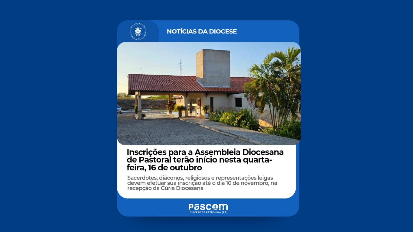 Nesta quarta-feira, 16 de outubro, na recepção da Cúria Diocesana, serão iniciadas as inscrições para a 34ª Assembleia Diocesana de Pastoral.