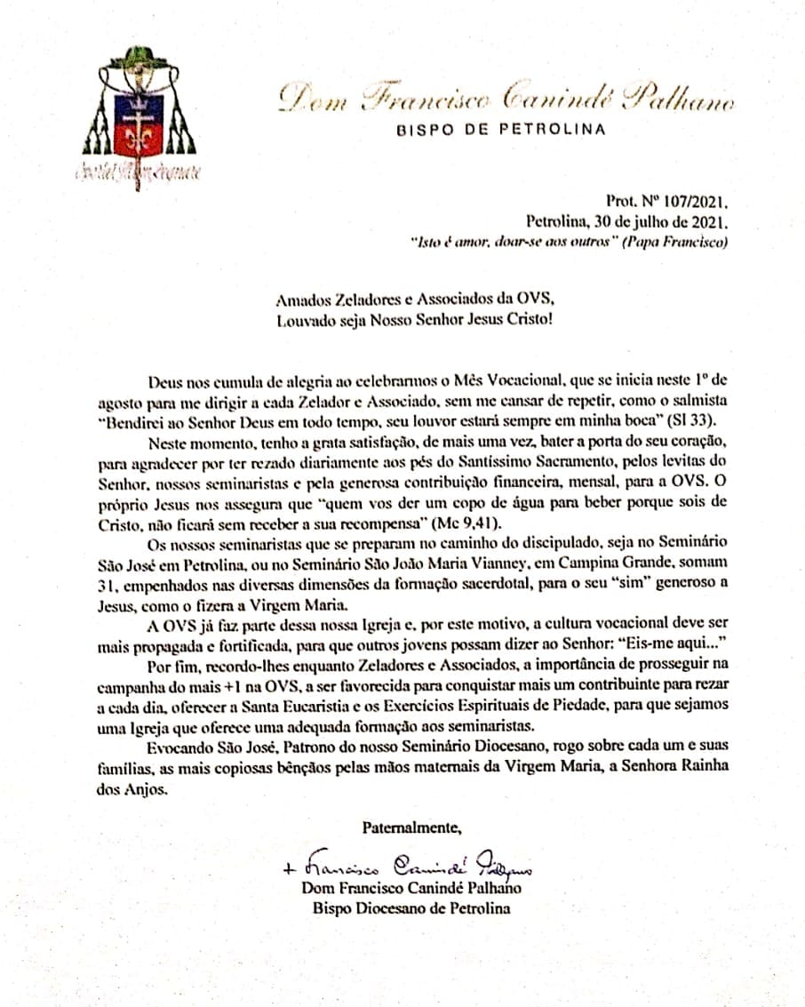 Mensagem de Dom Francisco aos Associados e Zeladores da OVS