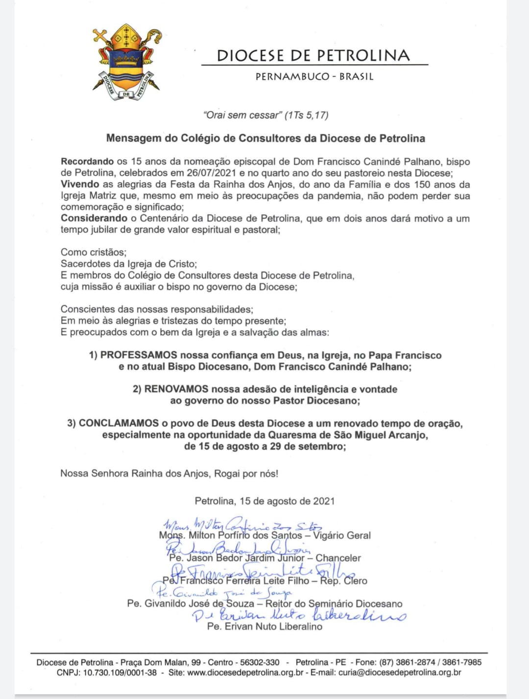 A Diocese de Petrolina, através do Colégio de Consultores, a saber, um grupo de Padres que segundo o Código de Direito Canônico, desempenha funções próprias junto ao Bispo Diocesano no governo de uma Diocese (Cân.502), por meio de Mensagem Oficial assinada pelos Reverendíssimos Sacerdotes que o compõem, manifesta sua proximidade, comunhão e filial adesão ao governo pastoral de Sua Excelência Reverendíssima, Dom Francisco Canindé Palhano, nesta Igreja Particular, e conclama todos os fiéis para que, unidos ao seu Pastor, possam cada vez mais trilhar o caminho da construção do Reino de Deus junto a esta porção do seu povo.