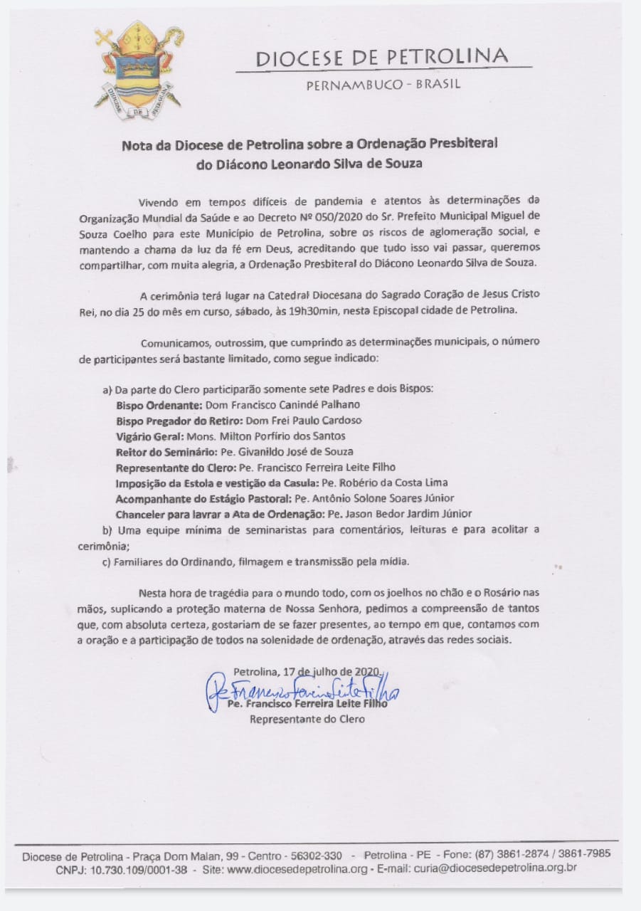 Nota da Diocese de Petrolina sobre a Ordenação Presbiteral do Diácono Leonardo Silva