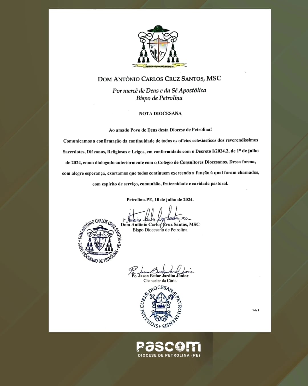 Nota Diocesana acerca da confirmação dos cargos eclesiásticos por Dom Antonio Carlos Cruz Santos, Bispo de Petrolina