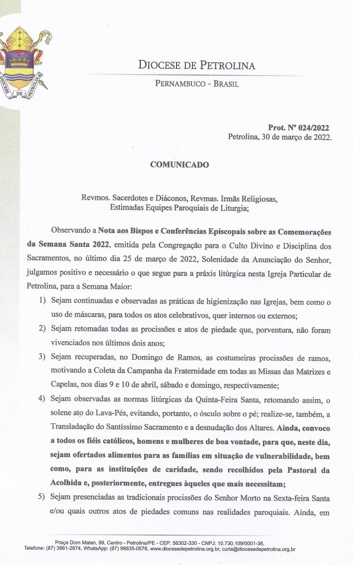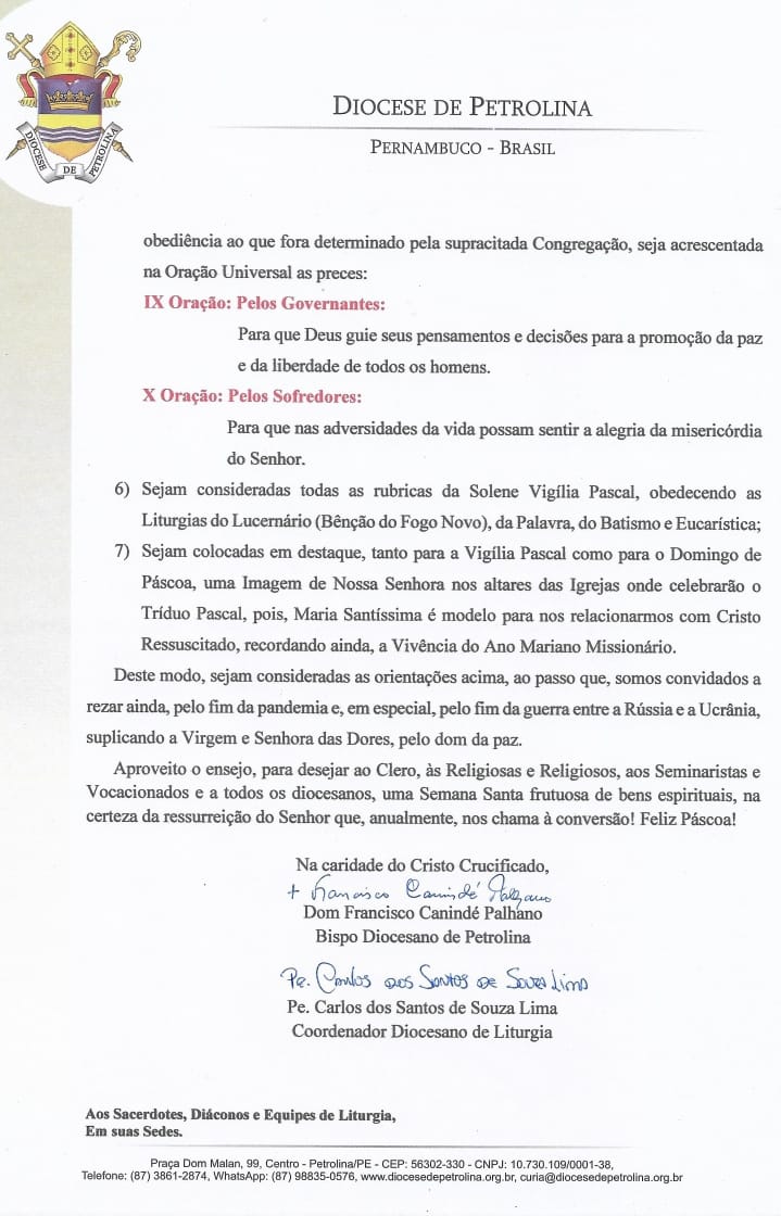 Orientações de Dom Francisco Canindé Palhano para as celebrações da Semana Santa na Diocese de Petrolina.