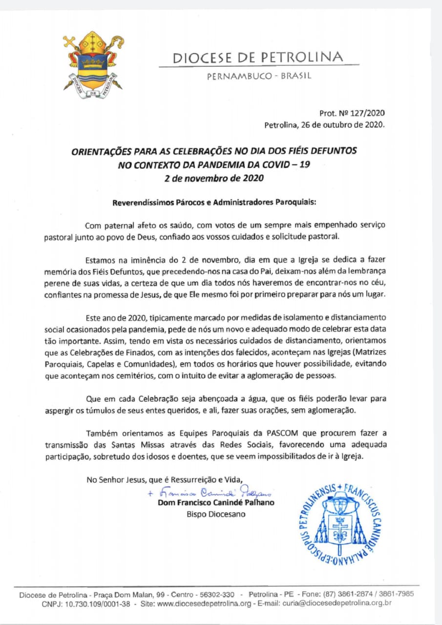 Orientações do Bispo Diocesano em relação às missas no Dia dos Fiéis Defuntos no contexto da pandemia.