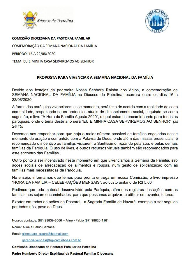 Na Diocese de Petrolina, como temos os festejos da Rainha dos Anjos neste período, a Semana da Família acontece sempre uma semana depois da data oficial. Acompanhe o comunicado da coordenação da Pastoral Familiar sobre as atividades para este ano, mesmo em meio à pandemia.