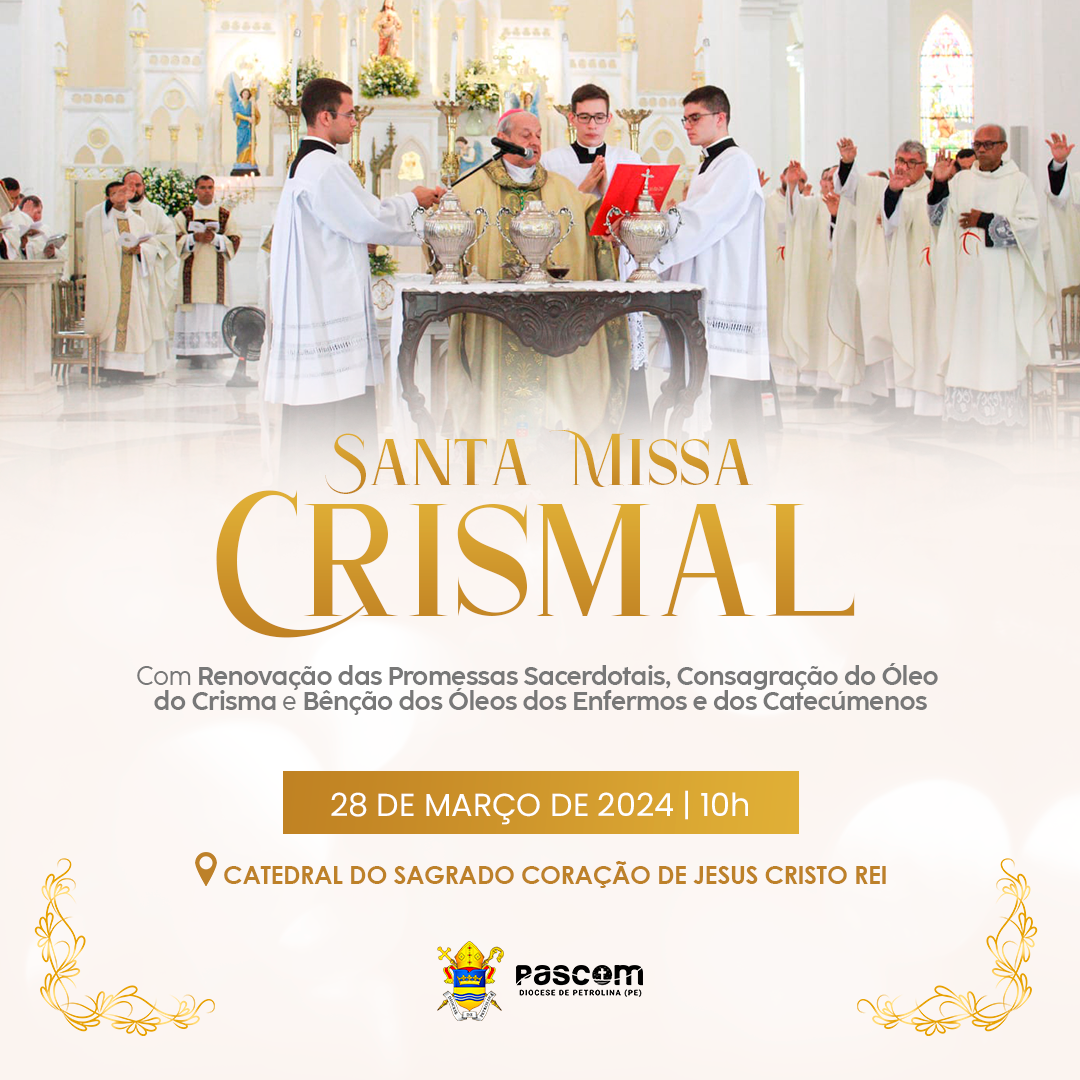Na Quinta-feira Santa, 28 de março, às 10h da manhã, na Igreja Catedral do Sagrado Coração de Jesus Cristo Rei, Dom Francisco Canindé Palhano presidirá a Santa Missa Crismal, com a Consagração do Óleo do Crisma, a Bênção dos Óleos dos Enfermos e dos Catecúmenos, e a presença dos padres da Diocese para a Renovação das Promessas Sacerdotais.