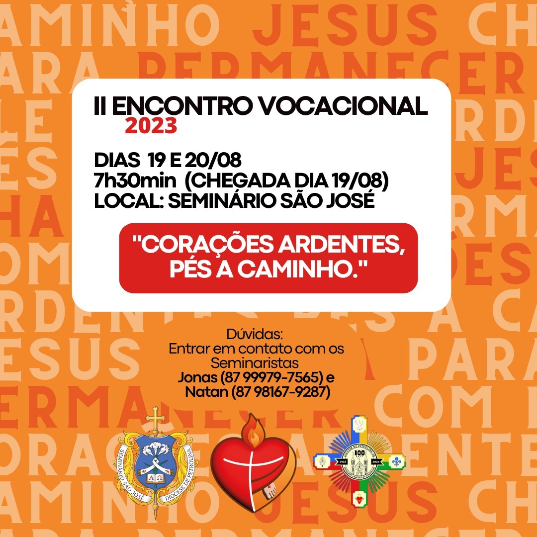 A Equipe do SAV do Seminário São José promoverá o II Encontro Vocacional nos dias 19 e 20 de agosto, nas instalações da casa formativa, situada no Bairro Areia Branca, em Petrolina. Os jovens do sexo masculino interessados deverão entrar em contato com os seminaristas Natan (87) 98167. 9287 ou Jonas (87) 99979. 7565. A confirmação deve ocorrer em tempo hábil, a fim de que a organização do evento organize material e o ambiente que acolherá os vocacionados que desejam discernir o seu chamado.