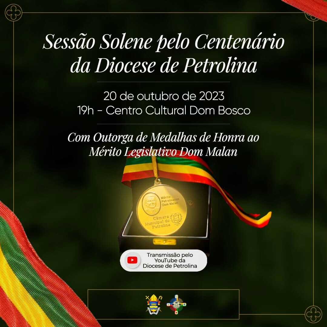 Dentro das comemorações do Jubileu Centenário desta Igreja Particular, a Câmara Municipal de Petrolina realizará Sessão Solene com Outorga de Medalhas de Honra ao Mérito Legislativo Dom Malan, no dia 20 de outubro (sexta-feira), às 19h, no Centro Cultural Dom Bosco.